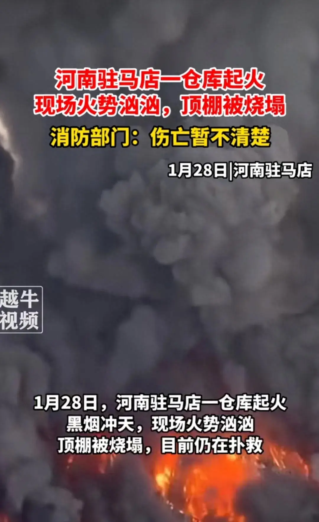 1月28日,網(wǎng)傳河南駐馬店一公司倉庫起火。據(jù)網(wǎng)絡(luò)視頻顯示,現(xiàn)場火勢洶洶,頂棚被燒塌黑煙沖天。15時左右,青蜂俠聯(lián)系到駐馬店市消防大隊,一工作人員表示火勢還未撲滅,火災(zāi)原因正在進(jìn)一步調(diào)查中,是否有人員傷亡情況暫不清楚。